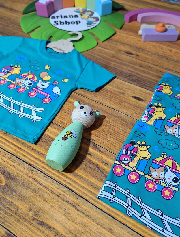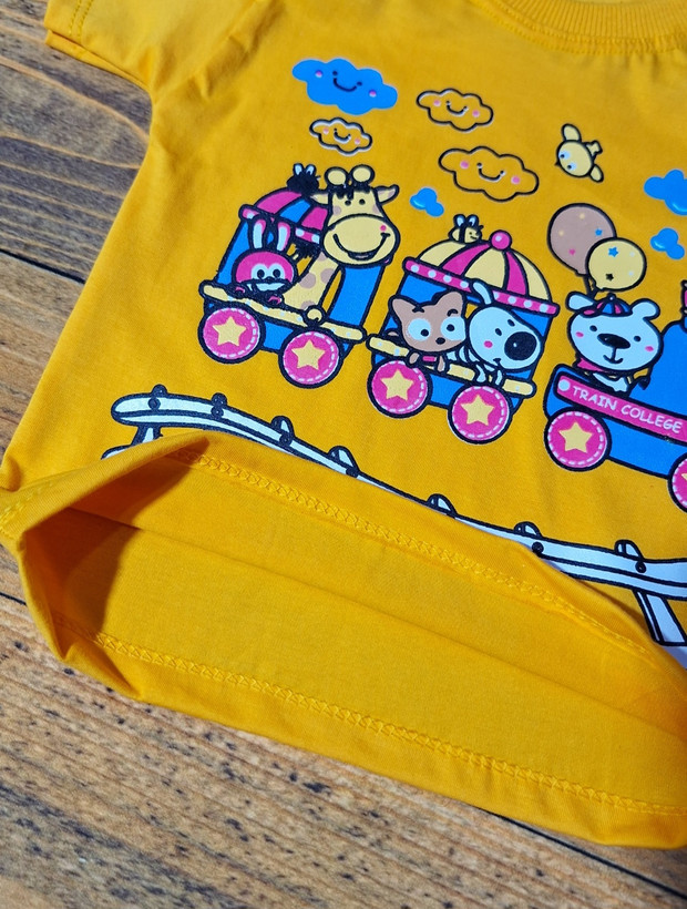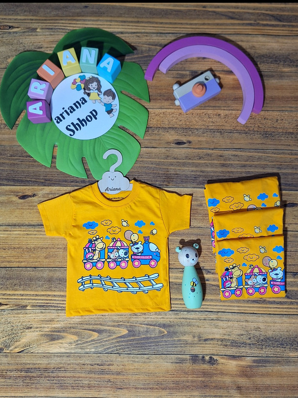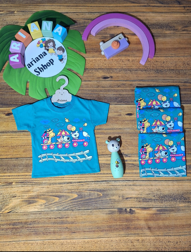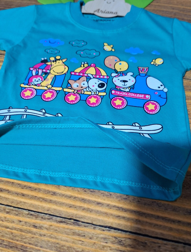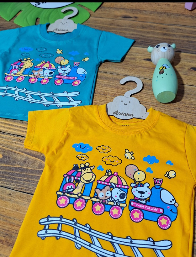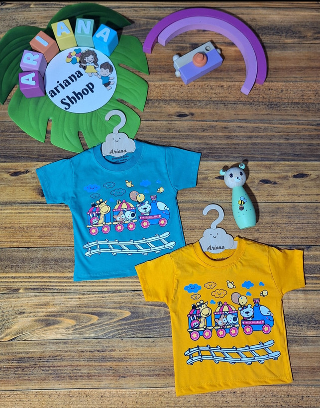 تیشرت تک نخ پنبه اعلا طرح قطار ریلی در ۲ رنگ خردلی و سبزآبی در سایزهای ۳۵ و ۴۰ و ۴۵و۵۰ :